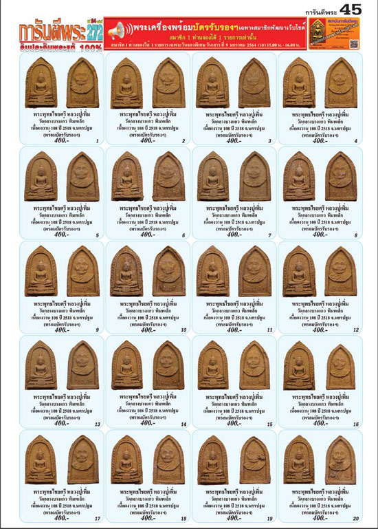 - เปิดเช่าพระเครื่องในราคา ** ถูกพิเศษ** ในหน้าพิเศษนี้ จำนวน 20 องค์ พร้อม ** บัตรรับรองพระเครื่องทุกองค์ ** ในวันเสาร์ที่ 9 มกราคม 64 เวลา 15.00-16.00 น. ที่เบอร์โทร 085-526-8682 และ 085-992-6303 เท่านั้น