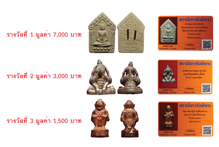- เพื่อแทนคำขอบคุณนี้ ทางเว็บไซต์ฯ ขอมอบพระเครื่องพร้อมบัตรรับรอง QR Code จำนวน 3 รางวัลประจำเดือนมิถุนายน 64 นี้ให้กับท่านสมาชิกฯ โดยทางเว็บไซต์ฯจะจับสลากจากรายชื่อท่านสมาชิกพัฒนาเว็บไซต์ฯทุกท่าน ในวันเสาร์ที่ 5 มิถุนายน 64 เวลา 16.00 น. และจะประกาศรายชื่อผู้ได้รับรางวัล ที่หน้าเว็บไซต์ฯในวันจันทร์ที่ 7 มิถุนายน 64 โดยท่านสมาชิกสามารถรับรางวัลได้ที่สถาบันการันตีพระ ชั้น 5 หรือ แจ้งให้จัดส่งทางไปรษณีย์ได้ทางไลน์แอดที่ @g-pra.payment (24 ชั่วโมง) หรือโทรแจ้งที่เบอร์โทร 02-551-2086 ( ค่าจัดส่ง 100 บาท )