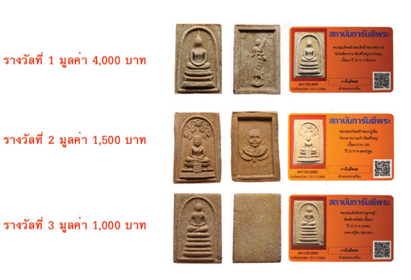 - เพื่อแทนคำขอบคุณนี้ ทางเว็บไซต์ฯ ขอมอบพระเครื่องพร้อมบัตรรับรอง QR Code จำนวน 3 รางวัลประจำเดือนธันวาคม 64 นี้ให้กับท่านสมาชิกฯ โดยทางเว็บไซต์ฯจะจับสลากจากรายชื่อท่านสมาชิกพัฒนาเว็บไซต์ฯทุกท่าน ในวันเสาร์ที่ 4 ธันวาคม 2564 เวลา 16.00 น. และจะประกาศรายชื่อผู้ได้รับรางวัล ที่หน้าเว็บไซต์ฯในวันจันทร์ที่ 6 ธันวาคม 2564 โดยท่านสมาชิกสามารถรับรางวัลได้ที่สถาบันการันตีพระ ชั้น 5 หรือ แจ้งให้จัดส่งทางไปรษณีย์ได้ทางไลน์แอดที่ @g-pra.payment (24 ชั่วโมง) หรือโทรแจ้งที่เบอร์โทร 02-551-2086 ( ค่าจัดส่ง 100 บาท )