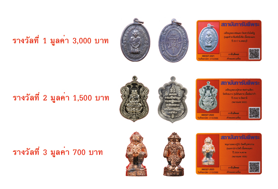 - เพื่อแทนคำขอบคุณนี้ ทางเว็บไซต์ฯ ขอมอบพระเครื่องพร้อมบัตรรับรอง QR Code จำนวน 3 รางวัลประจำเดือนเมษายน 2566 นี้ให้กับท่านสมาชิกฯ โดยทางเว็บไซต์ฯจะจับสลากจากรายชื่อท่านสมาชิกพัฒนาเว็บไซต์ฯทุกท่าน ในวันเสาร์ที่ 1 เมษายน 2566 เวลา 16.00 น. และจะประกาศรายชื่อผู้ได้รับรางวัล ที่หน้าเว็บไซต์ฯในวันจันทร์ที่ 3 เมษายน 2566 โดยท่านสมาชิกสามารถรับรางวัลได้ที่สถาบันการันตีพระ ชั้น 5 หรือ แจ้งให้จัดส่งทางไปรษณีย์ได้ทางไลน์แอดที่ @g-pra.payment (24 ชั่วโมง) หรือโทรแจ้งที่เบอร์โทร 02-551-2086 ( ค่าจัดส่ง 100 บาท )