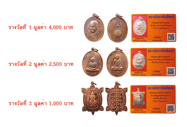 - เพื่อแทนคำขอบคุณนี้ ทางเว็บไซต์ฯ ขอมอบพระเครื่องพร้อมบัตรรับรอง QR Code จำนวน 3 รางวัล ประจำเดือนเดือนกันยายน 2566 นี้ให้กับท่านสมาชิกฯ โดยทางเว็บไซต์ฯจะจับสลากจากรายชื่อท่านสมาชิกพัฒนาเว็บไซต์ฯทุกท่าน ในวันเสาร์ที่ 2 กันยายน 2566 เวลา 16.00 น. และจะประกาศรายชื่อผู้ได้รับรางวัล ที่หน้าเว็บไซต์ฯในวันจันทร์ที่ 4 กันยายน 2566 โดยท่านสมาชิกสามารถรับรางวัลได้ที่สถาบันการันตีพระ ชั้น 5 หรือ แจ้งให้จัดส่งทางไปรษณีย์ได้ทางไลน์แอดที่ @g-pra.payment (24 ชั่วโมง) หรือโทรแจ้งที่เบอร์โทร 02-551-2086 ( ค่าจัดส่ง 100 บาท )
