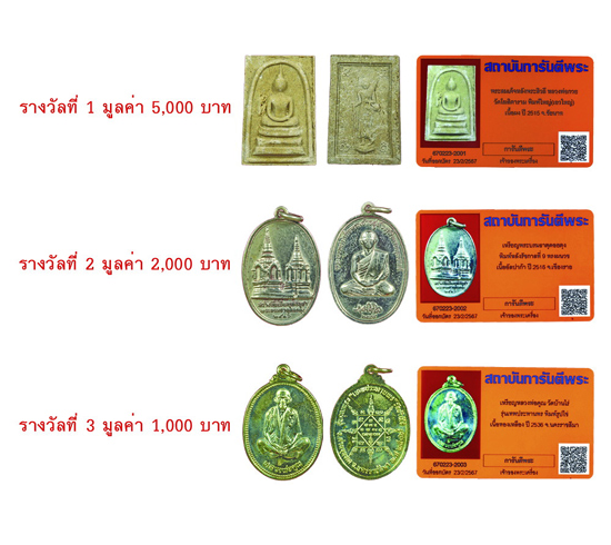 - เพื่อแทนคำขอบคุณนี้ ทางเว็บไซต์ฯ ขอมอบพระเครื่องพร้อมบัตรรับรอง QR Code จำนวน 3 รางวัล ประจำเดือนเดือนมีนาคม 2567 นี้ให้กับท่านสมาชิกฯ โดยทางเว็บไซต์ฯจะจับสลากจากรายชื่อท่านสมาชิกพัฒนาเว็บไซต์ฯทุกท่าน ในวันเสาร์ที่ 2 มีนาคม 2567 เวลา 16.00 น. และจะประกาศรายชื่อผู้ได้รับรางวัล ที่หน้าเว็บไซต์ฯในวันจันทร์ที่ 4 มีนาคม 2567 โดยท่านสมาชิกสามารถรับรางวัลได้ที่สถาบันการันตีพระ ชั้น 5 หรือ แจ้งให้จัดส่งทางไปรษณีย์ได้ทางไลน์แอดที่ @g-pra.payment (24 ชั่วโมง) หรือโทรแจ้งที่เบอร์โทร 02-521-0699 , 02-521-0712 ( ค่าจัดส่ง 100 บาท )