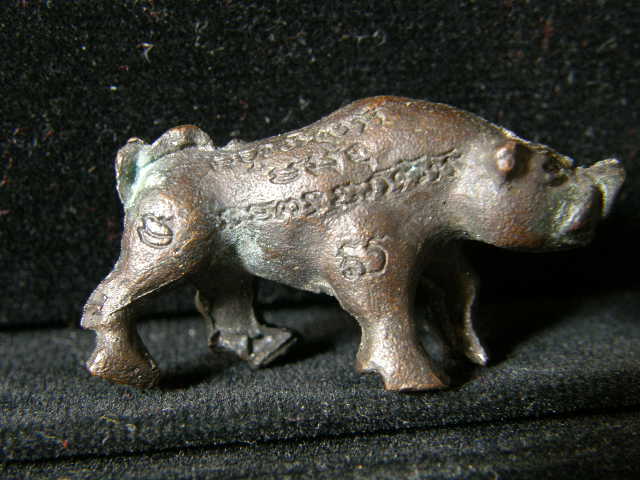 .....2.หมูป่า รุ่น2 สร้างปี 2522 เนื้อตะกั่วชุบทองแดง ความยาว 1.5 ซ.ม