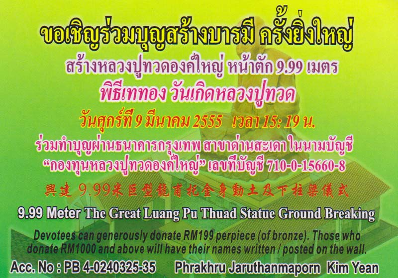 ติดต่อร่วมบุญสร้างบารมีได้โดย ผ่านธนาคารกรุงเทพ สาขาด่านสะเดา ในนามบัญชี "กองทุนหลวงปู่ทวดองค์ใหญ่" เลขที่ 710-0-15660-8