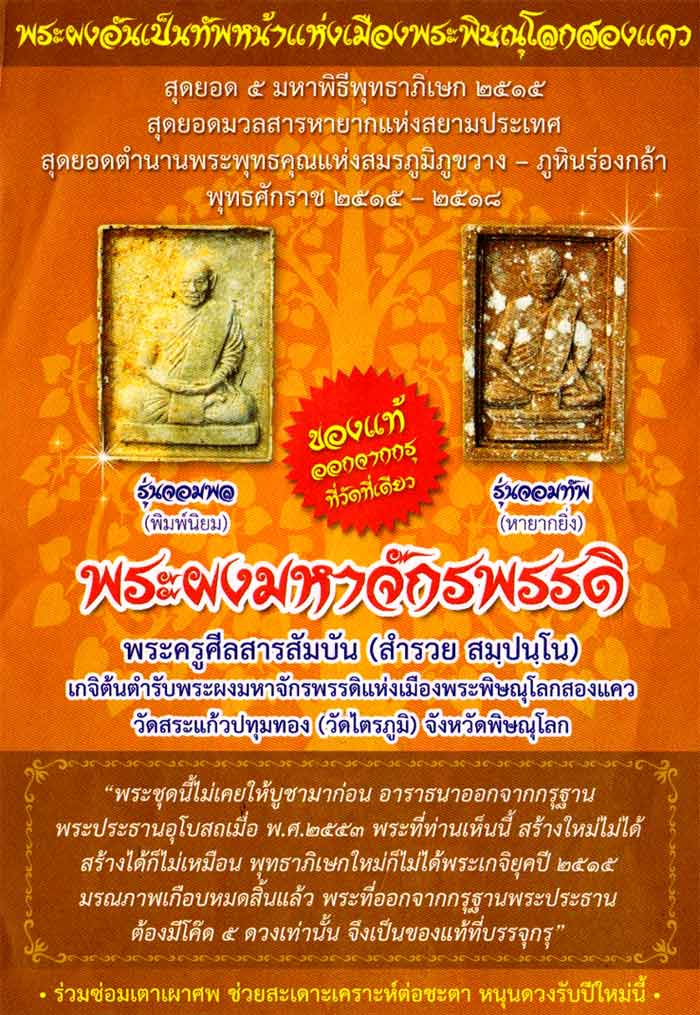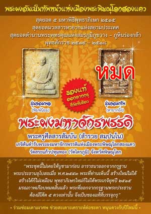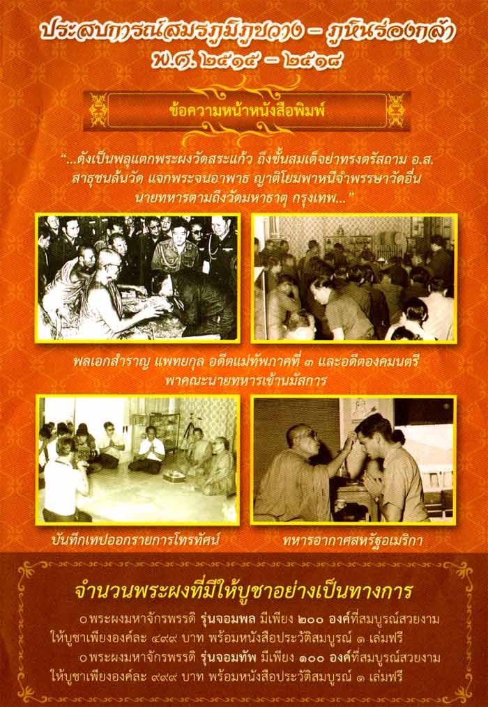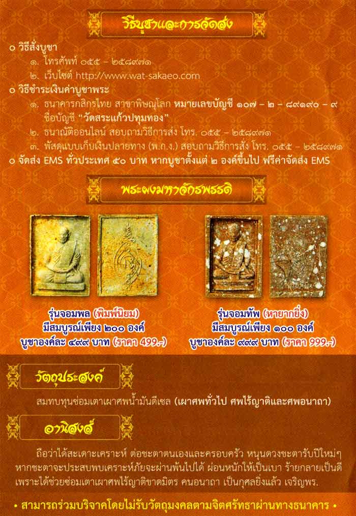 - พระผงมหาจักรพรรดิ รุ่นจอมพล มีเพียง ๒๐๐ องค์ ที่สมบูรณ์สวยงาม ให้บูชาเพียงองค์ละ ๔๙๙ บาท พร้อมหนังสือประวัติสมบูรณ์ ๑ เล่มฟรี
