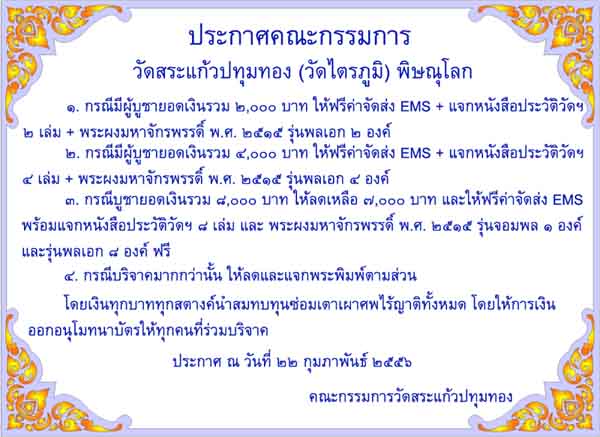 สามารถร่วมบริจาคโดยไม่รับวัตถุมงคลตามจิตศรัทธาผ่านทางธนาคาร