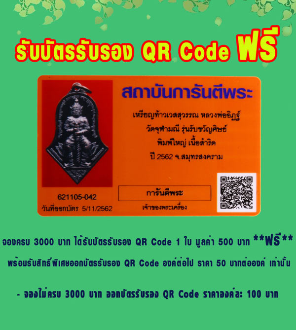 ... พร้อมรับสิทธิ์พิเศษออกบัตรรับรอง QR Code องค์ต่อๆไป ราคา 50 บาทต่อองค์ เท่านั้น
