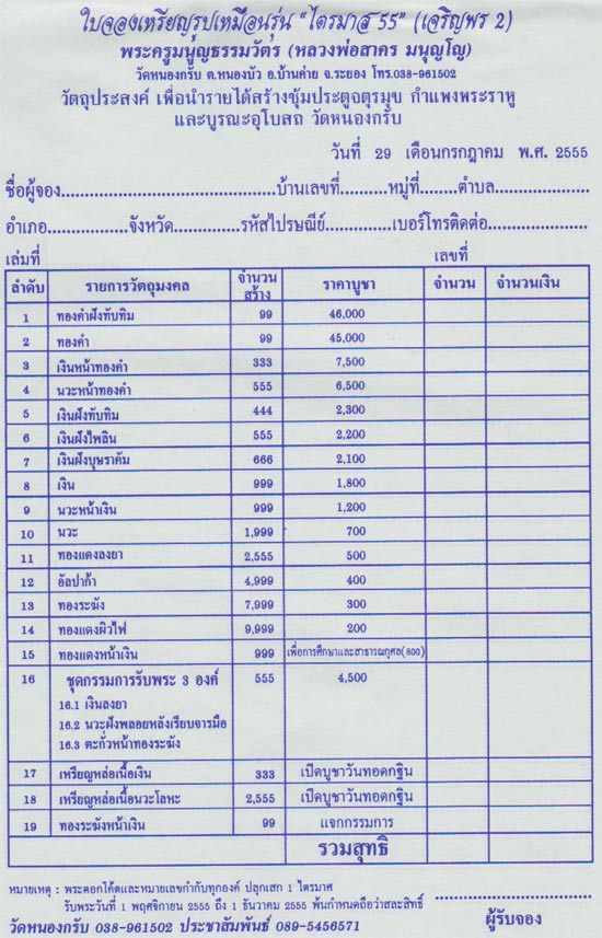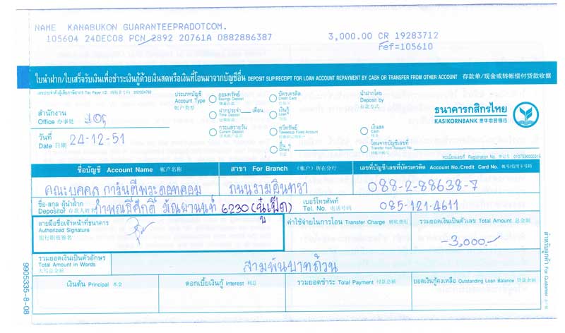 ท่านที่จองทางโทรศัพท์และทาง E-mail กรุณาโอนเงินเข้าบัญชีออมทรัพย์ "คณะบุคคล การันตีพระดอทคอม" ธนาคารกสิกรไทย สาขาถนนรามอินทรา บัญชีเลขที่ 088-2-88638-7 เพื่อความสะดวกรวดเร็วในการตรวจสอบ กรุณาโอนเพิ่มเศษสตางค์ เช่น 2,999.01 , 2,999.15 , 2,999.23