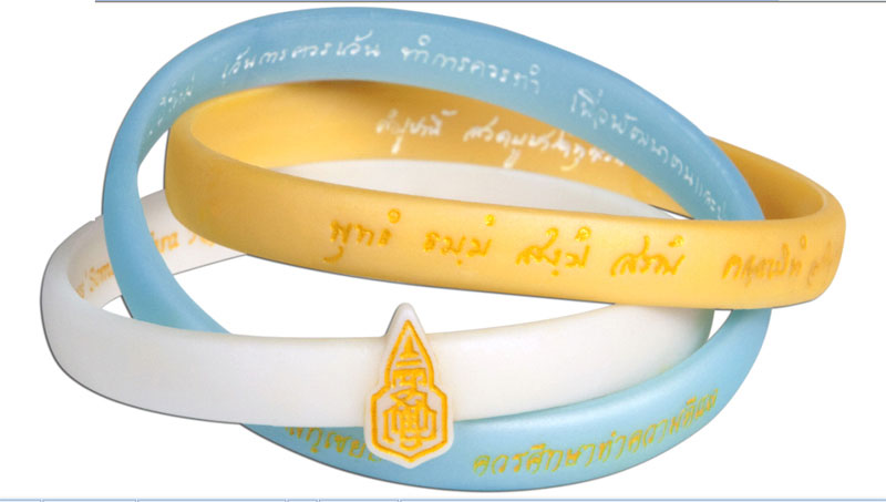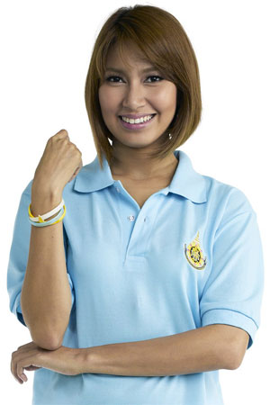 เป็นสายรัดข้อมือสามเส้น สามสี ร้อยเกี่ยวเข้าด้วยกัน มีเส้นสีเหลือง สีขาว และสีฟ้า ซึ่งสีทั้งสามสีนี้