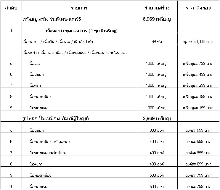 - ทุกศูนย์มีจะยอดเปิดจองจำนวน 5-7% จากจำนวนการสร้างทั้งหมด ของทั้ง เหรียญ ทุกเนื้อ และ รูปหล่อ ทุกเนื้อ
