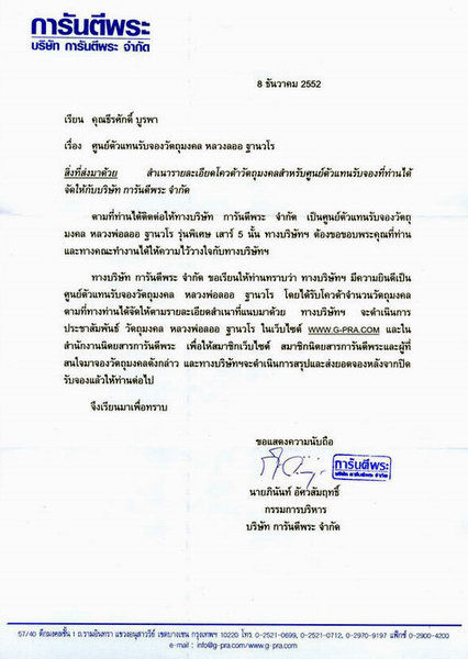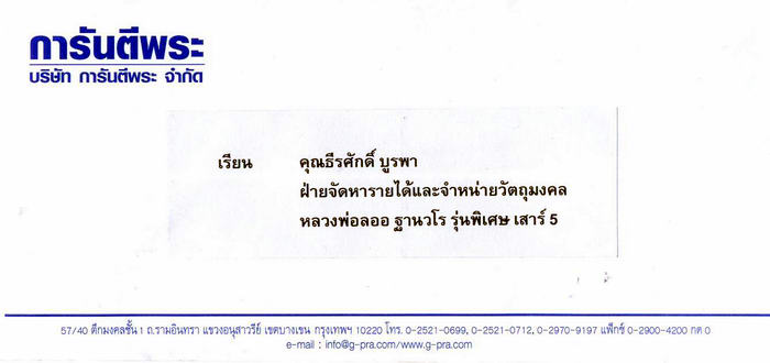 4. บริษัท การันตีพระ G-PRA.COM / 57/40 ตึกมงคล ถ.รามอินทรา แขวงอนุสาวรีย์ เขตบางเขน กรุงเทพฯ 10220 โทร 02-970-7949 02-970-7949