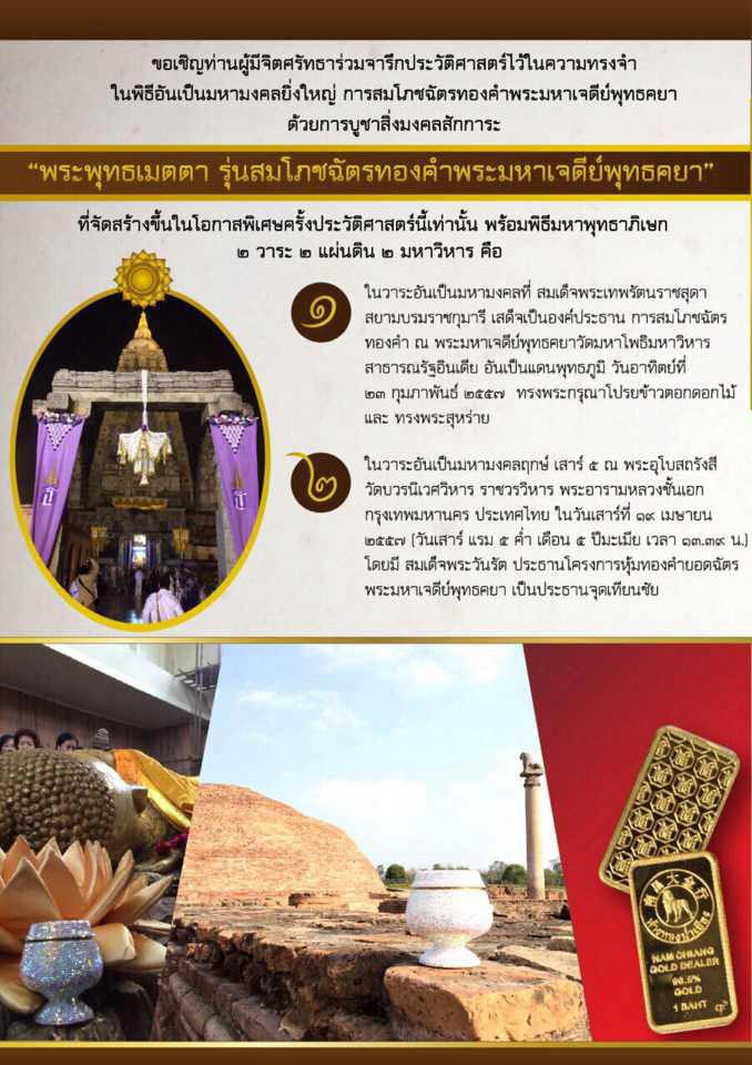 ๑.ในวาระอันเป็นมหามงคลที่ สมเด็จพระเทพรัตนราชสุดา สยามบรมราชกุมารี เสด็จเป็นองค์ประธาน การสมโภชฉัตรทองคำ ณ พระมหาเจดีย์พุทธคยาวัดมหาโพธิมหาวิหาร สาธารณรัฐอินเดียว อันเป็นแดนพุทธภูมิ วันอาทิตย์ที่ ๒๓ กุมภาพันธ์ ๒๕๕๗ ทรงพระกรุณาโปรยข้าวตอกดอกไม้ และ ทรงพระสุหร่าย