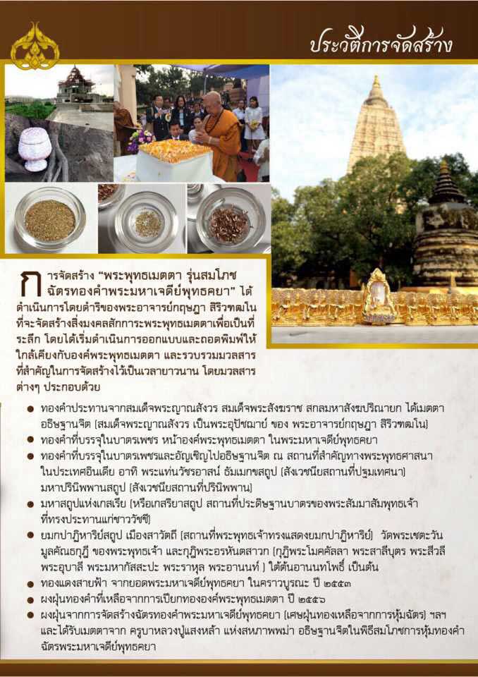 การจัดสร้าง "พระพุทธเมตตา รุ่นสมโภช ฉัตรทองคำพระมหาเจดีย์พุทธคยา" ได้ดำเนินการโดยดำริของพระอาจารย์กฤษฏา สิริวฑฒโน ที่จะจัดสร้างสิ่งมงคลสักการะพระพุทธเมตตาเพื่อเป็นที่ระลึก โดยได้เริ่มดำเนินการออกแบบและถอดพิมพ์ให้ใกล้เคียนกับองค์พระพุทธเมตตา และรวบรวมมวลสารที่สำคัญในการจัดสร้างไว้เป็นเวลายาวนาน โดยมวลสารต่างๆ ประกอบด้วย