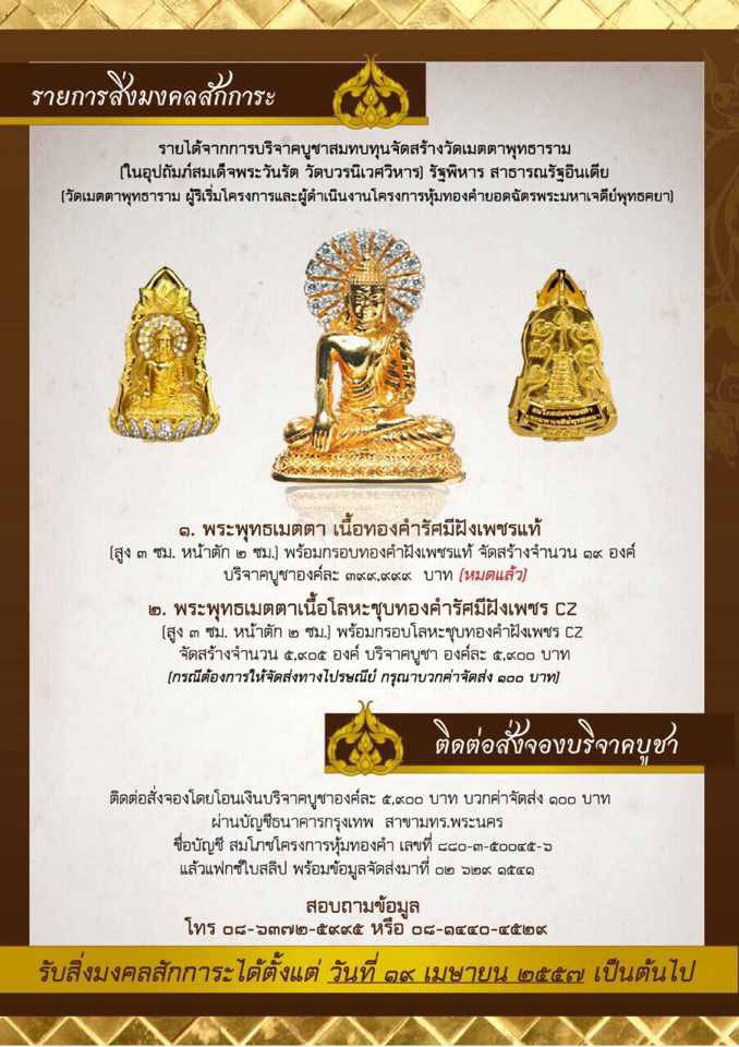 ๑.พระพุทธเมตตา เนื้อทองคำรัศมีฝังเพชรแท้(สูง ๓ ซม. หน้าตัก ๒ ซม.) พร้อมกรอบทองคำฝังเพชรแท้ จัดสร้างจำนวน ๑๙ องค์ บริจาคบูชาองค์ละ ๓๙๙,๙๙๙ บาท (หมดแล้ว)