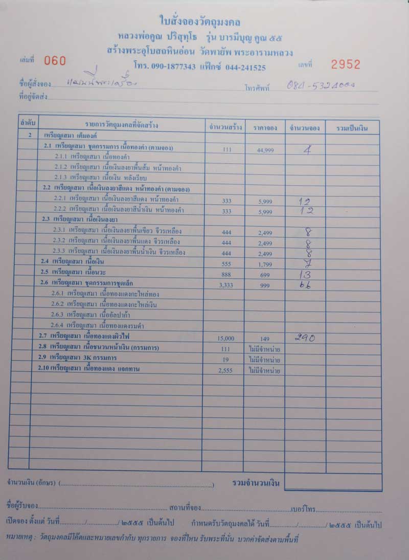 ร้าน ’แมนนี่พระเครื่อง’ เปิดรับจองหลวงพ่อคูณ รุ่น ‘ บารมีบุญ คูณ ๕๕ ’ สร้างอุโบสถหินอ่อน วัดพายัพ พระอารามหลวงมีโค๊ดและหมายเลข กำกับทุกรายการ ทุกรายการราคาวัด รับพระได้วันที่25 กรกฏาคม 25555 รายการตามรูปข้างบนเลยครับ