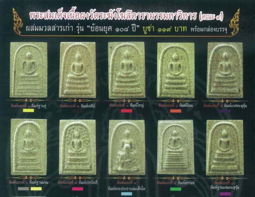 ท่านจะได้รับ พระสมเด็จเนื้อผงวัดระฆังโฆสิตารามวรมหาวิหาร (คณะ๙) ผสมมวลสารเก่า รุ่น "ย้อนยุค ๑๐๘ ปี" พร้อมกล่องบรรจุสวยงาม อย่างละ ๑ พิมพ์ (รวม ๑๐ พิมพ์)