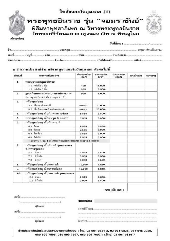 รายการที่ 6 เหรียญฉลุยกองค์พระพุทธชินราช "จอมราชันย์" เนื้อเงินลงยาราชาวดี สีแดง (รายการ 6.1), สีเขียว (รายการ 6.2), สีเหลือง (รายการ 6.3) หรือ สีน้ำเงิน (รายการ 6.4) ราคาเหรียญละ 3900 บาท จะได้รับพระพุทธชินราช พิมพ์แต่งฉลุลอยองค์ เนื้อนวโลหะ ราคา 1900 บาท ฟรีครับ
