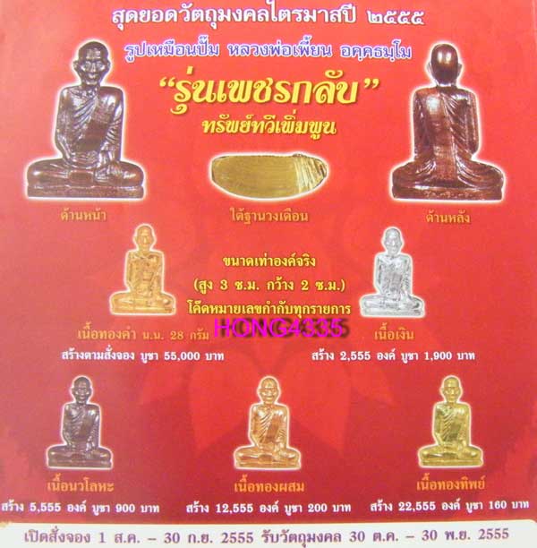 วัตถุมงคลไตรมาสปี 55 ((รูปเหมือนปั๊ม รุ่นเพชรกลับ ทรัพย์ทวีเพิ่มพูน )) หลวงพ่อเพี้ยน วัดเกริ่นกฐิน ลพบุรี