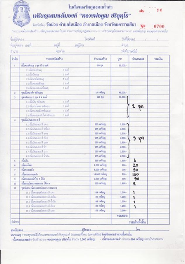 วัตถุประสงค์ในการจัดสร้าง เพื่อบูรณะโบสถ ศาลาการเปรียญ กุฎิสงฆ์ภาวนาสถานที่ชำรุดทรุดโทรมตามกาลเวลา และบำรุงพระพุทธศาสนาต่อไป