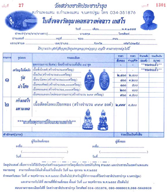 ** ค่าจัดส่ง EMS ทั่วประเทศท่านละ 80 บ. (ส่งใบจองตัวจริงให้ก่อน และส่งพระให้เมื่อพระออก)
