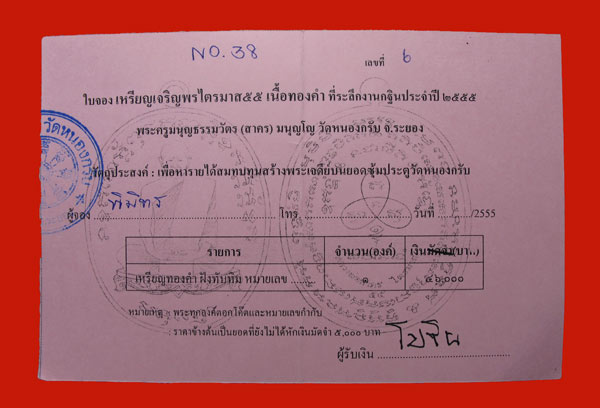 -เหรียญทองคำฝังทับทิม (หมายเลข 38) 1 เหรียญ (ใบจองวัด)