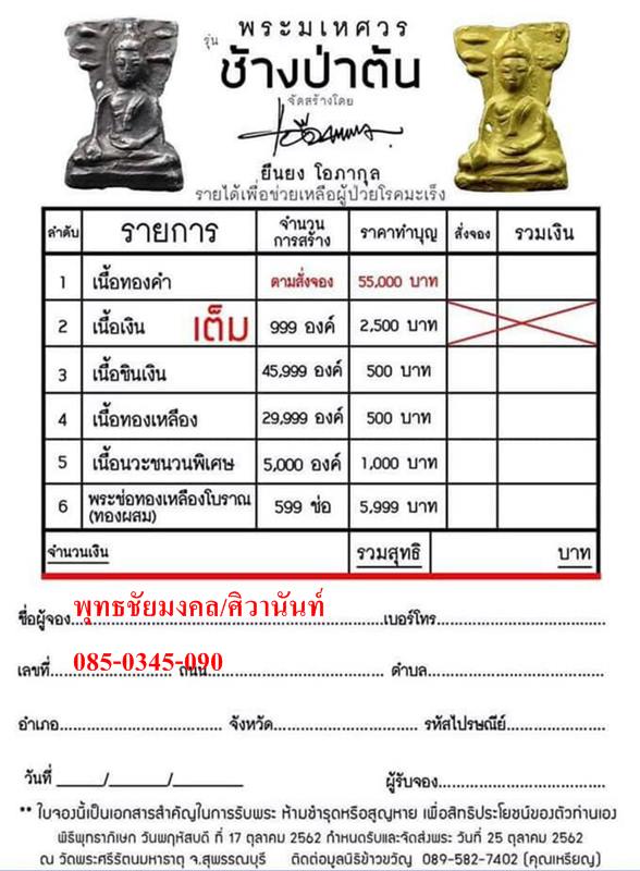 ....มีข่าวดีมาประกาศครับ เนื่องจากมีผู้อยากได้เนื้อเงิน 999 เป็นจำนวนมากที่จองเข้ามา แต่ว่ามันเต็มแล้ว คณะกรรมการจัดสร้างเลยตกลงจะเเบ่งเนื้อนวโลหะ จำนวน 2,000 องค์(จากที่จัดสร้างทั้งหมด5,000องค์เพื่อใช้แจกแขกผู้ใหญ่ที่มีอุปการะคุณ) เราขอจำหน่ายเพียงองค์ละ1,000 บาทเท่านั้นครับ และมีแค่2,000 องค์ จะมีรันนิ่งนัมเบอร์และตอกโค้ดเช่นเดียวกับเนื้อเงิน