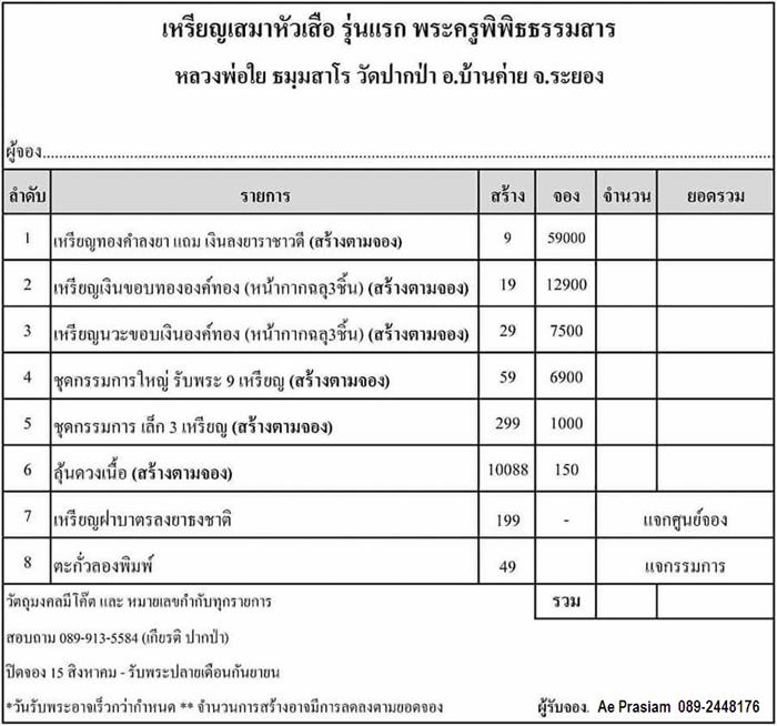 หมายเหตุ: วัตถุมงคลจัดสร้างตามจอง แต่ไม่เกินจำนวนที่ระบุไว้ในใบรายการ