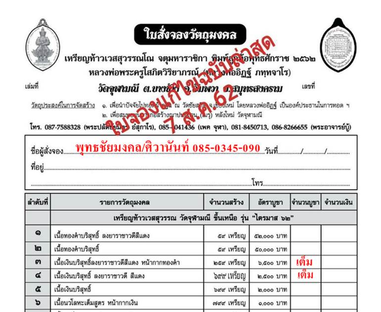 รับวัตถุมงคล ประมาณปลายเดือนตุลาคม 2562 จะประกาศให้ทราบอีกครั้ง