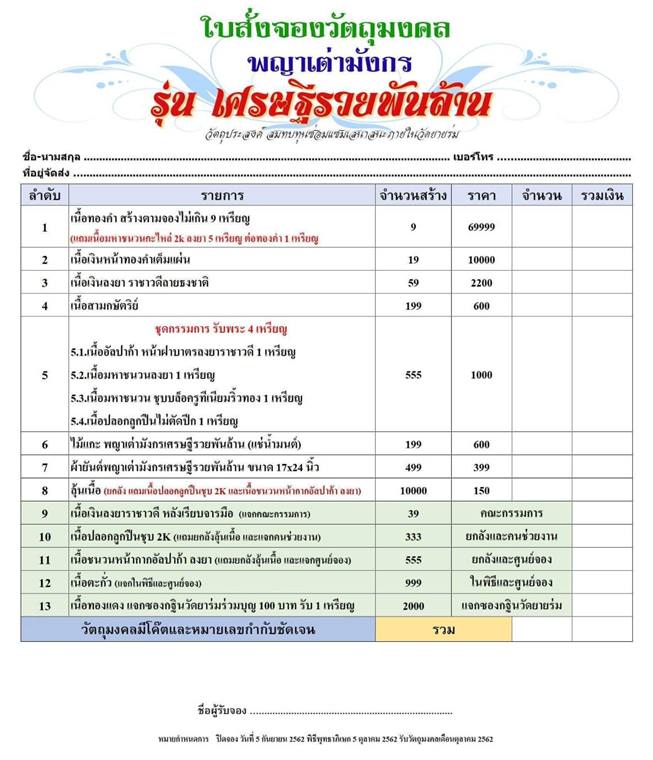 รายการ 2.เนื้อเงินหน้าทองคำเต็มแผ่น ราคาจอง 10,000.-บาท มียอด = สอบถาม