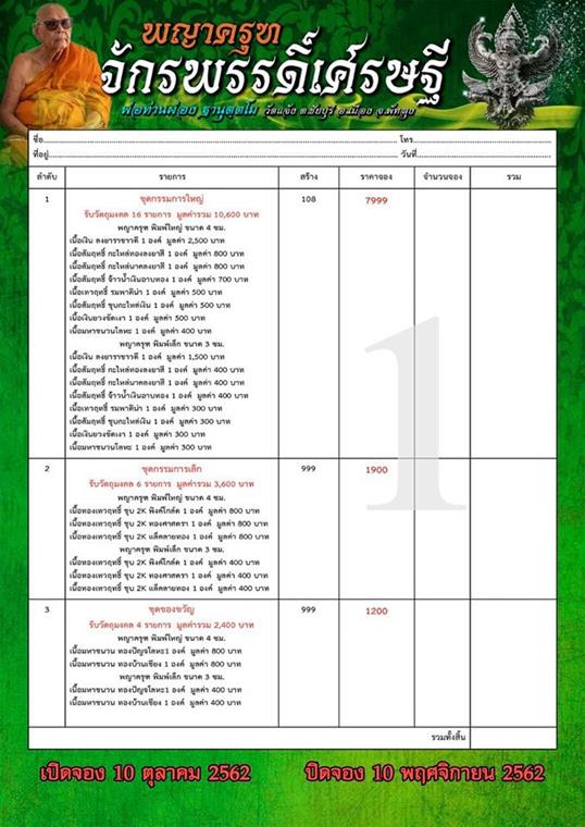 รายการ 1.ชุดกรรมการใหญ่ (รับวัตถุมงคล 16 รายการ) ราคาจอง 7,999.-บาท มียอด= สอบถาม