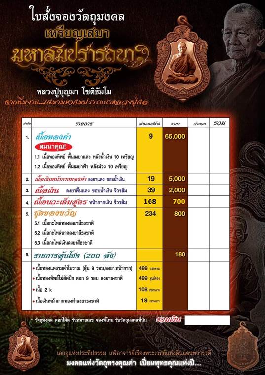 รายการ 1.เนื้อทองคำ (+เหรียญสมนาคุณ 20 เหรียญ) ราคาจอง 65,000.-บาท มียอด=สอบถาม