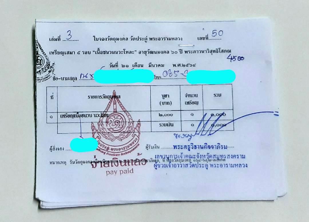 ใบจองพระมหาสุรศักดิ์ เสมา 5 รอบ นวะ ฯ