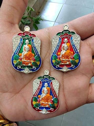 1. เนื้อเงินซาตินลงยาจีวร ลงยาไก่หน้าหลัง 1 เหรียญ