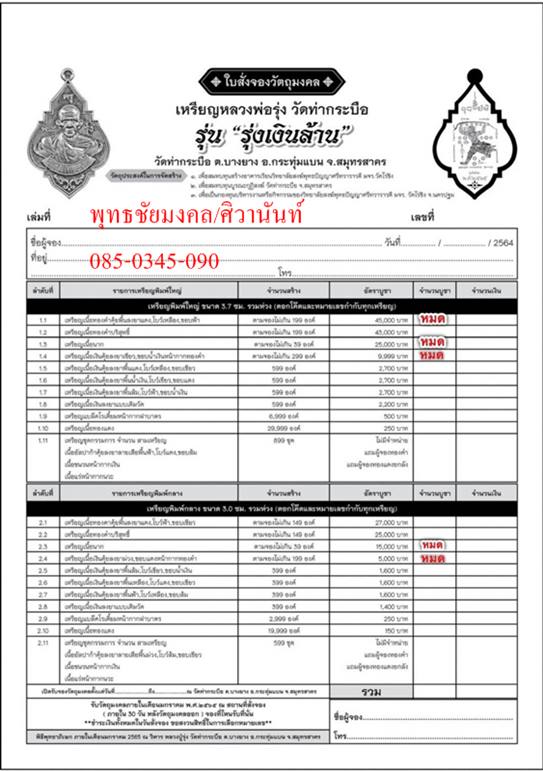 รับหลังพิธี ( ภายใน 30 วัน หลังวัตถุมงคลออก