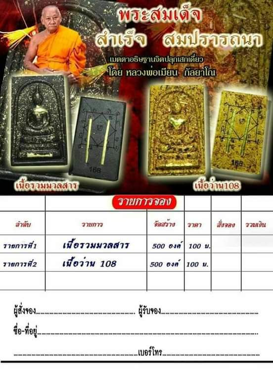 พระสมเด็จ สำเร็จ สมปรารถนารุ่นนี้ จัดสร้างเป็นครั้งแรก รุ่นแรกในพิมพ์แบบนี้ ทำการจัดสร้างเป็นเนื้อรวมมวลสาร ว่าน108 ว่านทางโภคทรัพย์ ว่านทางคงกะพัน มหาอุดและผงเสกต่างๆตะไบพระกริ่งต่างๆ พลอยเสก เนื้อหามวลสารจัดเต็มดีนอกดีใน หลวงพ่อเมียน จะเน้นปลุกเสกให้เด่นรอบด้าน ทั้งด้านเมตตามหานิยม มหาเสน่ห์ มหาโภคทรัพย์ มหาลาภ มหาอุด คงกระพัน หนุนดวง ป้องกันสิ่งไม่ดี แคล้วคลาด ตัดปัญหา อุปสรรคให้ผ่านไปด้วยดี สอบเลื่อนขั้นเลื่อนตำแหน่งดีนัก ค้าขาย ติดต่อการงานใดสำเร็จได้โดยง่ายคิดสิ่งใดสมปรารถนาดั่งใจหวัง อธิษฐานขอสิ่งใด ล้วนสำเร็จได้โดยง่าย หากเป็นสิ่งดีงามด้วยอานุภาพแห่งพุทธาคมและบารมีหลวงพ่อเมียน กัลยาโณ