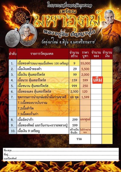 รายการ 1.เนื้อทองคำ (สมนาคุณเนื้อสัตตะ 100 เหรียญ) ราคาจอง 55000.-บาท มียอด = สอบถาม