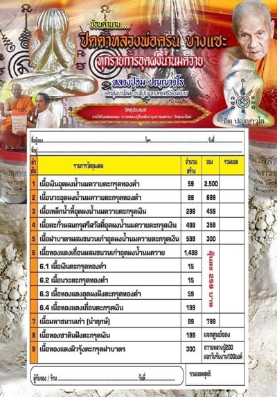 รายการ 5. เนื้อทองฝาบาตรผสมชนวนเก่าอุดผงน้ำนมควายตะกรุดเงิน ราคาจอง 300.-บาท มียอด = 20
