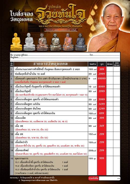 รายการ 3.เนื้อทองคำ อุดมวลสาร/จีวร/เกศา/ข้าวก้นบาตร ราคาจอง 99,999.-บาท มียอด = สอบถาม