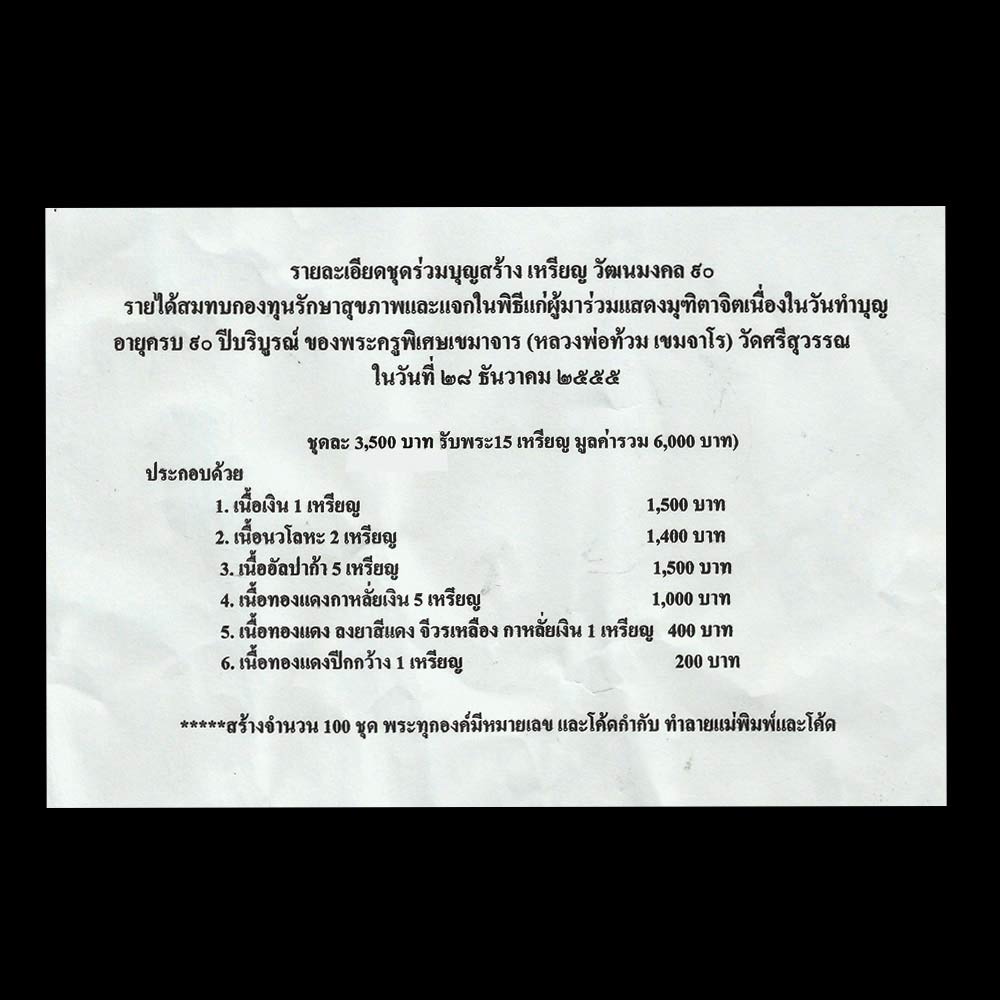 รายละเอียดชุดร่วมบุญสร้าง เหรียญ วัฒนมงคล 90 รายได้สมทบกอง ทุนรักษาสุขภาพและแจกในพิธีแก่ผู้มาร่วมแสดงมุฑิตาจิตเนื่องในว ันทำบุญอายุครบ 90 ปี บริบูรณ์ ของพระครูพิเศษเขมาจาร(หลวงพ่อท ้วม เขมจาโร) วัดศรีสุวรรณ ในวันที่ 28 ธันวาคม 2555 พร้อมตัวอ ย่างรูปแบบเหรียญครับ ท่านใดสนใจร่วมทำบุญ..โทร..084-5438931/081-5696914 เตี้ย.สุราษครับ พระมีจำนวนจำกัดโทรก่อนได้ก่อน |