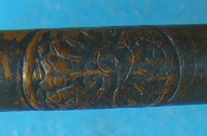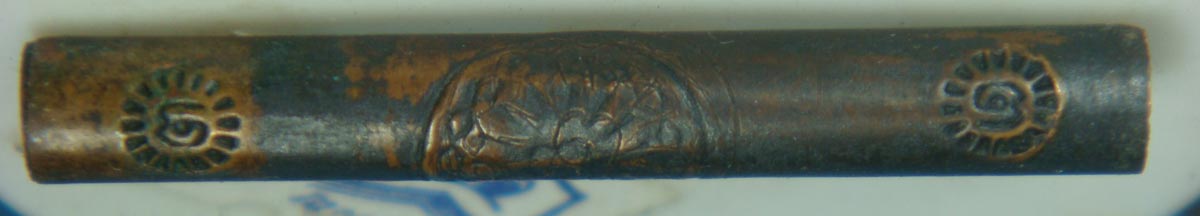 ตะกรุดทองแดงยาวประมาณ1.5นิ้ว โต0.5เซนต์ ม้วน3รอบครึ่ง ด้านนอกตัดปลายเฉียงทั้ง2ด้าน ด้านในไม่ตัด ตอก3โค๊ดๆ ที่มาจากพระผู้ใหญ่ท่านหนึ่งบอกว่าเป็นตะกรุดหลวงปู่โต๊ะ ต่อมาผมเห็นมีตะกรุดตะกั่วประมูลในเวปจีก็เทียบโค๊ดตัวกลาง เห็นว่าตัว ตเต่าของเราใหญ่กว่าตัวตะกรุดตะกั่วจึงเก็บไว้ไม่ได้สนใจ ทีนี้เห็นภาพประกอบของผู้ประมูลท่านหนึ่งมีโค๊ดเหมือนๆกับของผม 3โค๊ด ตัวตเต่าก็ใหญ่จึงถ่ายภาพมาถามอาจารย์ว่า แท้ไม่แท้ประการใดครับ โค็ดตัวกลางตอก2ครั้งจึงยิ่งดูยากครับ |