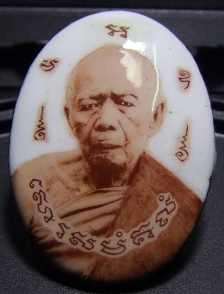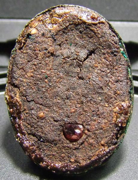ด้านหลังที่เห็นจากพิจรณาแล้วน่าจะเป็นผงยาจินดาครับกลิ่นเดี่ยวกัน และได้นำเอาเหรียญห่วงเชื่อมมากดเอาไว้เป็นหลังแบบ มีพลอยฝังชัดเจน......
