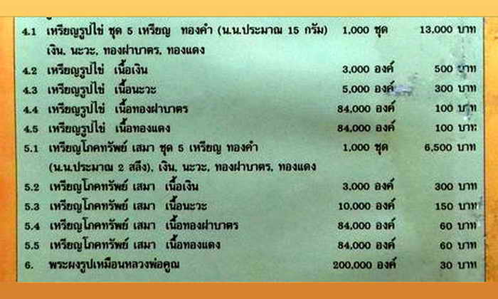 1. ชุดทองคำ 1,000 ชุด ประกอบด้วย ทองคำ, เงิน , นวะโลหะ , ทองฝาบาตร , ทองแดง