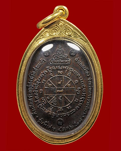ด้าน หลังบรรจุดวงชะตาของ หลวงพ่อคูณ ล้อมด้วยพระคาถาภาษาขอมว่า " สะนิทัสสะนะ อัปปะฏิคา " " มะอะอุ " เป็นพระคาถามหาอุด หยุดกระสุนปืนมิให้ออก