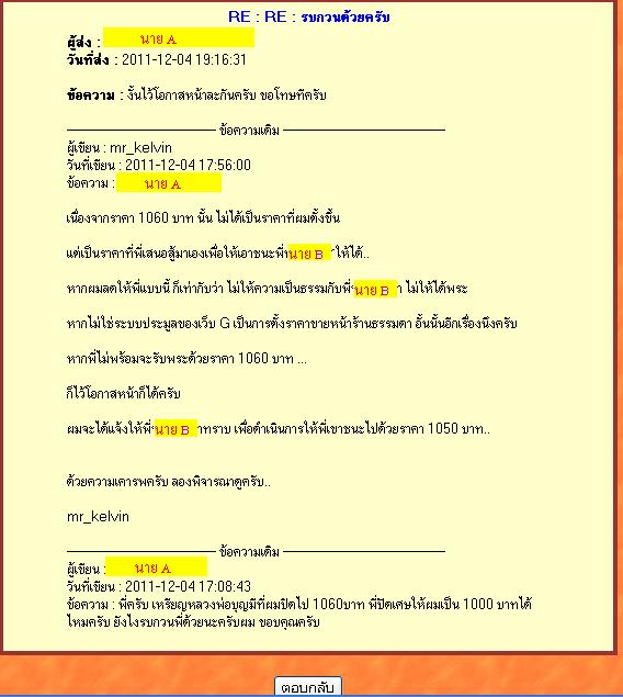 บอกว่า พี่เขาก็ไม่ได้เสียดายเงิน 100 บาทเขาก็เพิ่มให้ได้ แต่เขาไม่พอใจ ที่ผมเขียนข้อความตอบกลับไปว่า หากไม่สะดวกที่จะรับพระในราคา 1060 บาท ผมก็จะขออนุญาตติดต่อพี่นาย B ให้เป็นผู้ชนะการประมูลแทน..จึงขอยกเลิก..