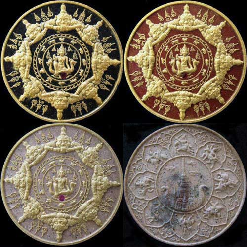 2. เหรียญปิดตาพังพกาฬ เนื้อทองคำลงยา 1 เหรียญ, เนื้อเงินลงยา 1 เหรียญ, เนื้อเงิน 1 เหรียญ, เนื้อนวโลหะ 1 เหรียญ, เนื้อทองแดง 10 เหรียญ รวม 1 ชุด 14 เหรียญ ขนาด 3.2 ซม. สร้าง 39 ชุด จองชุดละ 39,000 บาท