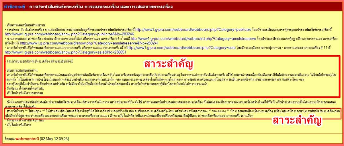 กระดานคุยเฟื่องหากลงเพื่อประโยชน์ในการนำเสนอพระเครื่องสร้างใหม่ เช่น จุดเด่นของพระเครื่องรุ่นนั้น ชนวนมวลสารในการจัดสร้าง รูปแบบกล่อง ฯลฯ เหล่านี้ล้วนต้องอยู่ในการประชาสัมพันธ์ทั้งนั้น หรือเพื่อประโยชน์ในการจอง การขาย ต่างๆ ก็ถือว่าผิดกฏไม่สามารถลงได้