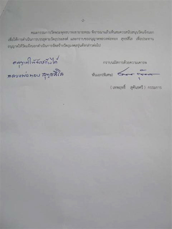 เนื่ิงจากวัตถุมงคลรุ่นนี้ ได้ทำการขออนุญาติ และได้มีใบอนุญาติการจัดสร้าง ถูกต้องชัดเจน พร้อมจะถวายเงินจำนวน 1500,000 (หนึ่งล้านห้าแสนบาท) ให้กับทางวัด.. แต่ทางวัดปฎิเสธที่จะทำการปลุกเสกให้ จึงต้องปรับยอดลดจำนวนลงจากยอดเดิมที่ตั้งใจไว้... แล้ววัตถุมงคลที่ทำมาแล้ว จะให้ผมเอาไปไหน จะให้นำไปทิ้ง หรือ จะให้นำไปหลอม.. ผมไม่กล้าครับ .!!เพราะเป็นใบหน้าของ หลวงพ่อทอง จึงได้นำวัตถุมงคลหลวงพ่อทองมาให้หลวงพ่อคูณปลุกเสกให้ ตามเจตนารมภ์ของผมในฐานะผู้สร้าง...หากใครคิดจะร่มบุญในครั้งนี้ เชิญเช่าหาบูชาได้ครับ...