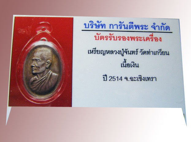 บัตรรับรอง การันตีพระ หลวงพ่อจันทร์ วัดท่าเกวียน