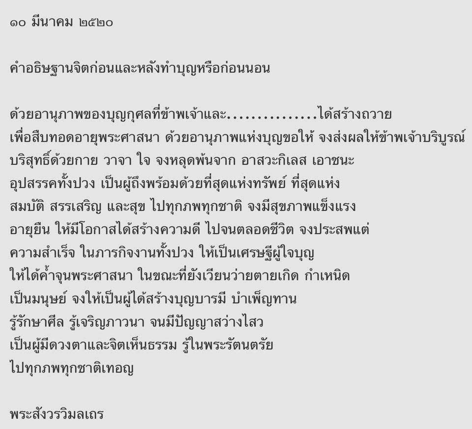 ในสมัยนั้น น้อยครั้งที่ผมจะมีโอกาสได้เห็นลายมือหลวงปู่ท่านเขียนเป็นข้อความต่างๆแบบต็มๆ เคยเห็นอยู่ครั้งหนึ่งในคราวที่พวกพี่ๆขออนุญาตเปิดสมุดจด ในวันที่หลวงปู่นัดที่จะไปงานพุทธาภิเษกต่างๆ นอกนั้นจะเห็นแค่อักขระยันต์ และที่หลวงปู่เขียนข้อความอวยพรที่ เวลามีศิษย์มาเช่ารูปหลวงปู่จากทางวัด และนำขึ้นมาให้หลวงปู่ทานจารยันต์อีกครั้งหนึ่ง ข้อความที่ท่านเขียนบ่อยคือ " เจริญรุ่งเรืองร่มเย็น " ในยุคนั้นมักมีศิษย์ที่มาพูดคุยกับหลวงปู่มักถามหลวงปู่ และคำที่มักได้ยินอยู่เป็นประจำบ่อยๆคือ " หลวงปู่เจ้าคะ หลังจากทำบุญแล้วจะอธิฐานอย่างไรถึงจะถูกต้องเจ้าคะ " ซึ่งคำถามนี้พวกพี่ๆก็เคยมานั่งคุยกันว่า เออ..จริงหลังจากทำบุญแล้วจะอธิษฐานอย่างไรให้ถูกต้อง เมื่อมีโอกาสกลุ่มพี่ๆและผม เมื่อคราวที่ได้ไปวัด ก็ได้เรียนถามหลวงปู่ หลวงปู่ท่านจึงพูดว่า " ดี...ถามดี " และให้หากระดาษมาให้หลวงปู่ ๑ แผ่น ทีแรกก็ฉีกกระดาษจากหนังสือปกอ่อนธรรมดา พอดีวันนั้นรุ่นพี่ที่ชื่อเฮียวีระชัยได้ซื้อกระดาษ ๑๐๐ ปอนด์มาพอดี เพราะเฮียวีระชัยจะเขียนภาพพระโพธิสัตว์กวนอิมถวายหลวงปู่ เฮียก็เลยบอกว่าให้ใช้กระดาษ ๑๐๐ ปอนด์ดีกว่า ก็นำตัดให้หลวงปู่ ท่านจึงหยิบดินสอเขียนเดี๋ยวนั้นเลย เอาไว้ให้กลุ่มคณะพี่ๆว่า เวลาทำบุญหรือก่อนนอนควรจะอธิฐานจิตอย่างไรให้ถูกต้อง จึงฝากภาพลายมือสุดยอดหายากของหลวงปู่พระอาจารย์ของพวกเรา ไว้ให้ศิษย์รุ่นหลังที่ไม่ทันท่านไว้ดูนะครับ ว่านี่คือลายมือของสุดยอดพระอริยสงฆ์องค์หนึ่งของประเทศไทย |