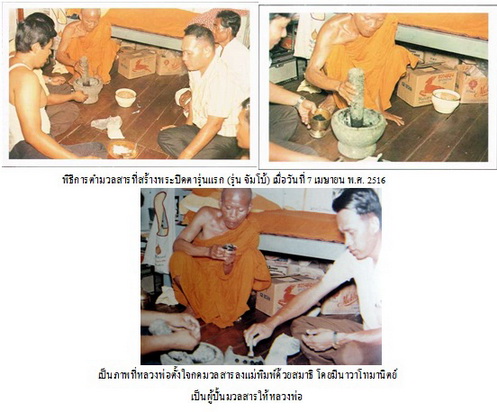 พิธีการตำมวลสารที่สร้างพระปิดตารุ่นแรก (รุ่น จัมโบ้) เมื่อวันที่ 7 เมษายน พ.ศ. 2516